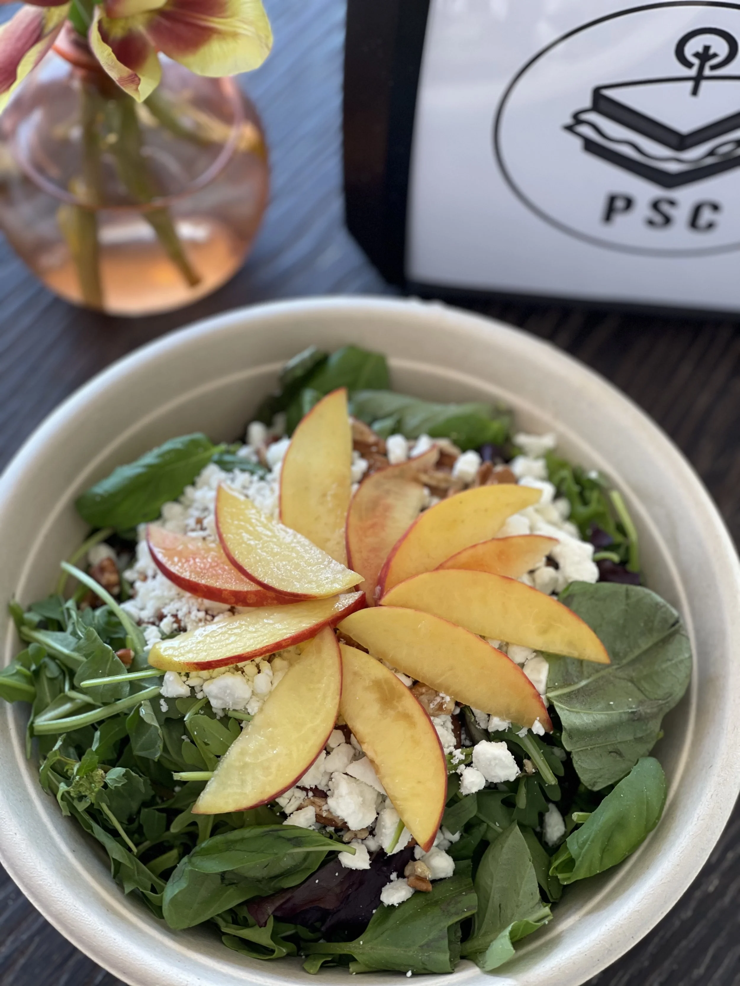 Peachtree House Salad - arugula and field greens with sliced peaches (or apples if peaches aren't in season!), basil, goat cheese, red onions and pecans