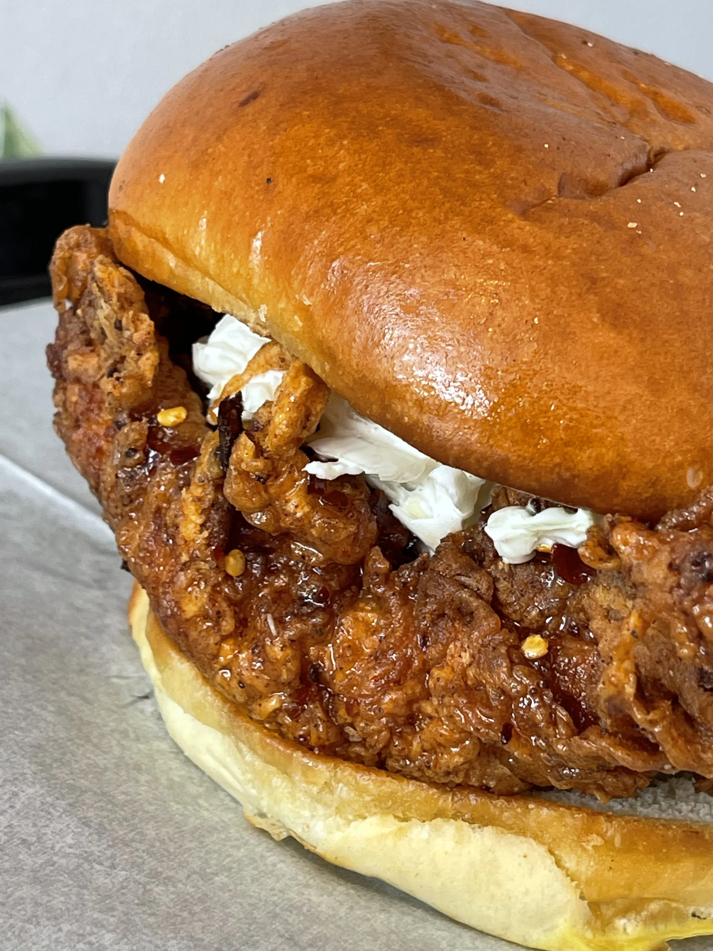 The Chicken - fried chicken breast brushed with hot honey and topped with southern slaw on a toasted brioche roll